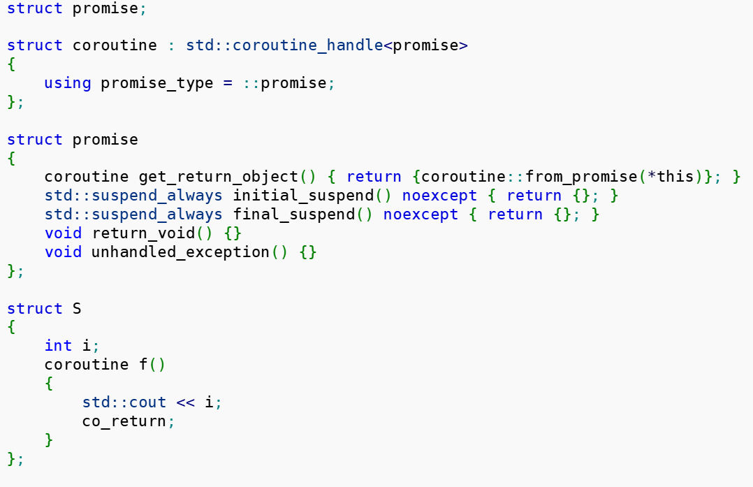 1 2 3 4 5 6 7 8 9 10 11 12 13 14 15 16 17 18 19 20 21 22 23 24 class RTN_OBJ { public : class promise_type { public : RTN_OBJ get_return_object () { return {}; } std::suspend_never initial_suspend () noexcept { return {}; } std::suspend_never final_suspend () noexcept { return {}; } void return_void () {} void unhandled_exception () {} }; }; RTN_OBJ MyCoroutine () { co_return ; } int main () { auto promise = new RTN_OBJ::promise_type; RTN_OBJ rtn_obj = promise->get_return_object (); return 0 ; }