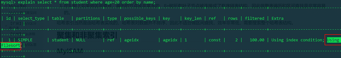 虽然用到了age索引,但是依然会出现using filesort,这是由于name索引失效的问题。