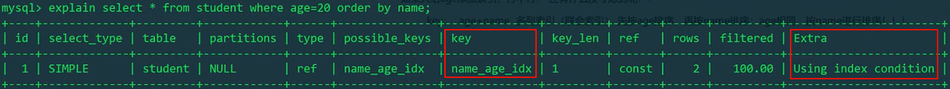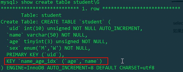 1 | EXPLAIN SELECT * FROM student WHERE name='zhangsan'; |