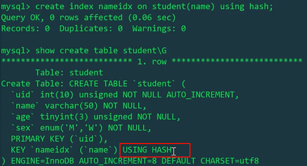 虽然指定了使用哈希索引,并且表结构也显示USING HASH,但实际上用的什么索引结构是不确定的。