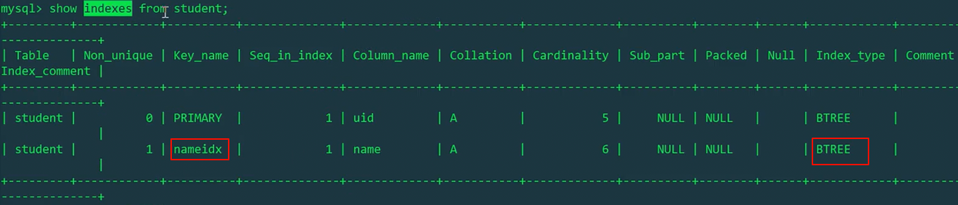 可以看到,实际上,刚才创建的nameidx依然为BTREE索引结构。