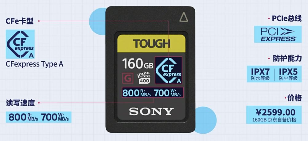 CFe-A卡使用了PCIe总线作为数据传输,读写速度往往可达700 MB/s到800 MB/s。