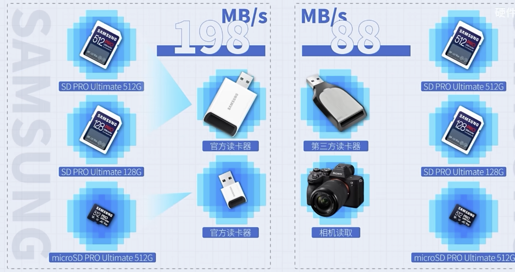 一般只有搭配官方的读卡器才能达到预期速度,使用相机、第三方读卡器会导致速度偏低。