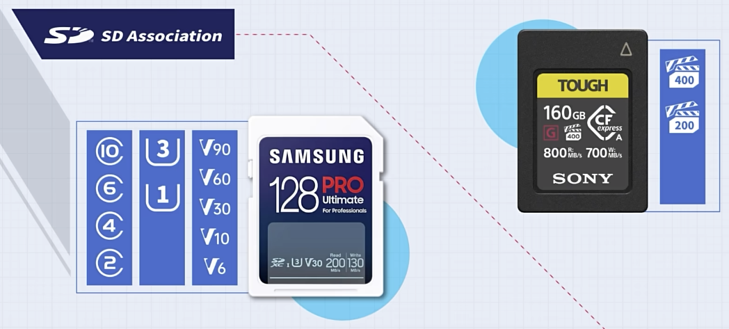 很多卡在相机录制过程中会中断,这时与“最低顺序写入速度”有关。存储卡的各个协会将之作为带圈的数字标识在了卡面。有C系列、U系列、V系列。还有CFe卡的VPG标识。