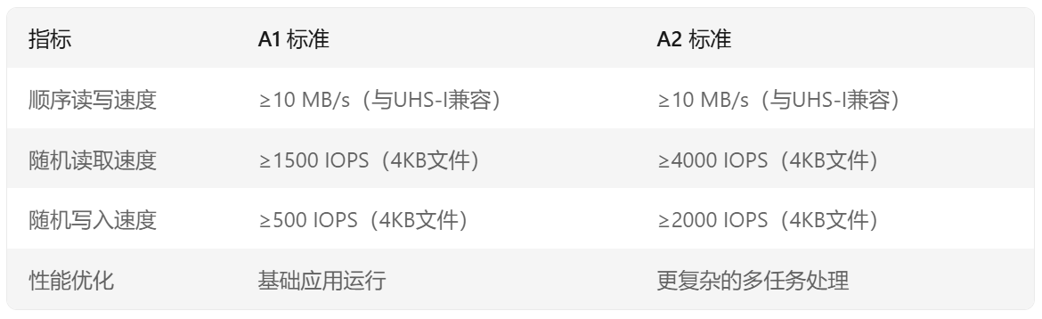 存储卡的A1(App Performance A1)和A2(App Performance A2)是SD卡协会制定的应用性能等级标准,主要针对在移动设备(如智能手机、平板电脑)上运行应用程序时的性能需求。两者的核心区别在于随机读写速度和性能优化。
