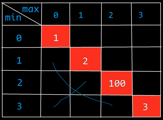 1 2 3 4 5 6 7 8 9 10 11 12 13 14 15 16 17 18 19 20 21 22 23 24 25 26 27 28 29 30 31 32 33 34 35 36 37 38 39 Score king_interation (int left, int right) { for (int i = left; i <= right; ++i) { scores[i][i].current = arr[i]; scores[i][i].other = 0 ; } std::cout << "Matrix:" << std::endl; for (int i = 0 ; i < 4 ; ++i) { for (int j = 0 ; j < 4 ; ++j) { std::cout << scores[i][j].current << "," << scores[i][j].other << " " ; } std::cout << std::endl; } for (int j = left + 1 ; j <= right; ) { int i; for (i = left; i <= right - (j - i); ++i, ++j) { int pickLeft = arr[i] + scores[i + 1 ][j].other; int pickRight = arr[j] + scores[i][j - 1 ].other; if (pickLeft > pickRight) { scores[i][j].current = pickLeft; scores[i][j].other = scores[i + 1 ][j].current; } else { scores[i][j].current = pickRight; scores[i][j].other = scores[i][j - 1 ].current; } } j = j - i + 1 ; } return scores[left][right]; }