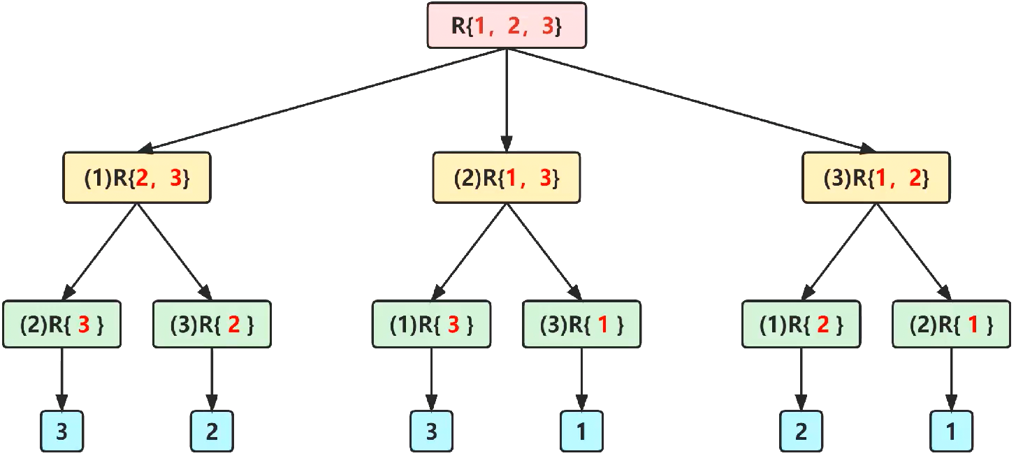 比如:R = { 1 , 2 , 3 } R=\{1,2,3\} R = { 1 , 2 , 3 } ,则p e r m ( R ) perm(R) p e r m ( R ) 由( 1 ) p e r m ( { 2 , 3 } ) , ( 2 ) p e r m ( { 1 , 3 } ) , ( 3 ) p e r m ( { 1 , 2 } ) (1)perm(\{2,3\}),(2)perm(\{1,3\}),(3)perm(\{1,2\}) ( 1 ) p e r m ( { 2 , 3 } ) , ( 2 ) p e r m ( { 1 , 3 } ) , ( 3 ) p e r m ( { 1 , 2 } ) 构成。