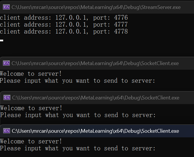 1 2 3 4 5 6 7 8 9 10 11 12 13 14 15 16 17 18 19 20 21 22 23 24 25 26 27 28 29 int main () { while (true ) { std::jthread t ([client_addr, work_sock]() mutable { wchar_t addr_str[46 ] = L"" ; InetNtopW(AF_INET, reinterpret_cast <void *>(&client_addr.sin_addr), addr_str, 46 ); std::wcout << std::format(L"client address: {}, port: {}\n" , addr_str, ntohs(client_addr.sin_port)); ::closesocket(work_sock); work_sock = INVALID_SOCKET; }) ; t.detach (); } ::closesocket (listen_sock); listen_sock = INVALID_SOCKET; ::WSACleanup (); return 0 ; }