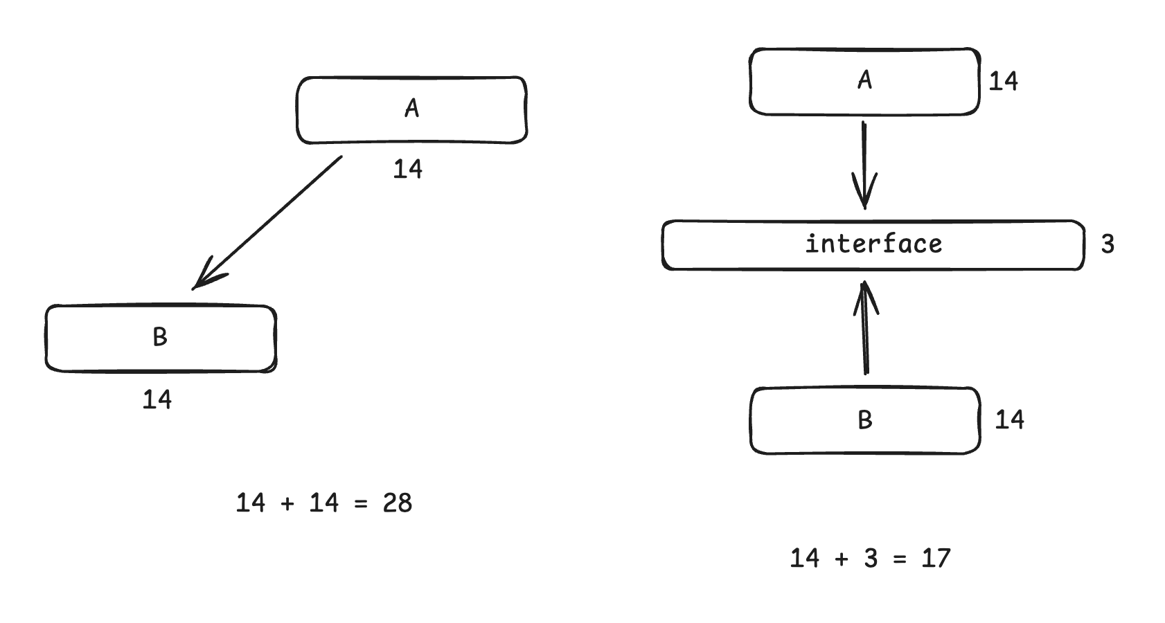 - 而如果A、B在事先经过良好的协商,规范出一套接口的话,A、B就可以共同依赖这个接口,各自同时开发。假如协商需要3天,那么开发周期只需要天。