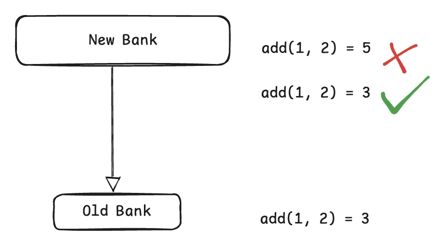 比如:Old Bank的add行为结果是3,而New Bank的add虽然形式上一致,但行为却不正确。违反了里氏替换原则。猜测New Bank在重写add方法后,优化代码或更新、升级组件后造成了副作用,导致运行时行为不一致、结果不正确。