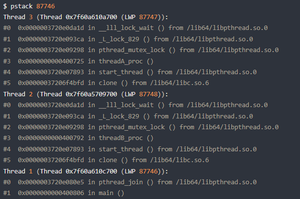 pstack 命令可以显示每个线程的栈跟踪信息(函数调用过程),pstack <pid>