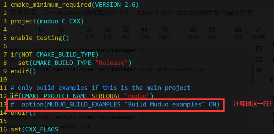 源码编译构建程序,运行该程序(注意:muduo是用cmake来构建的,需要先安装cmake,ubuntu下sudo apt-get install cmake