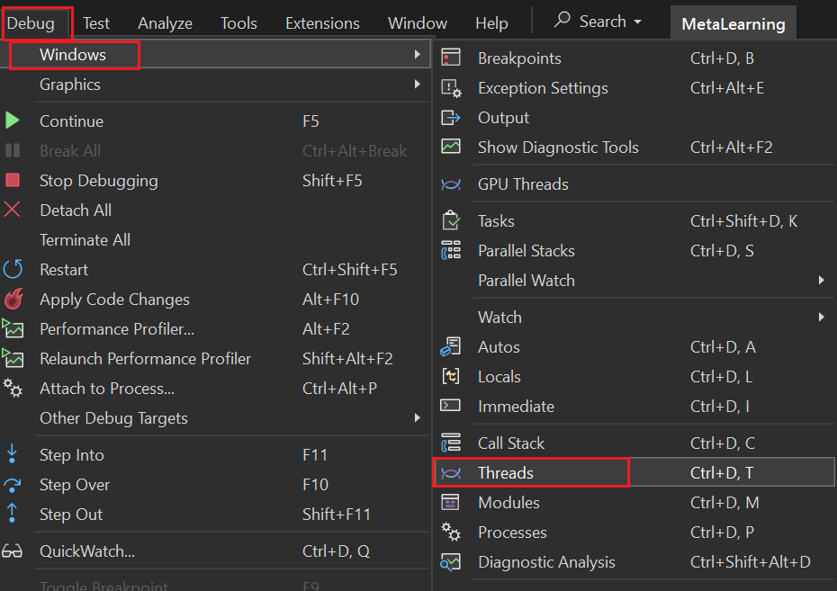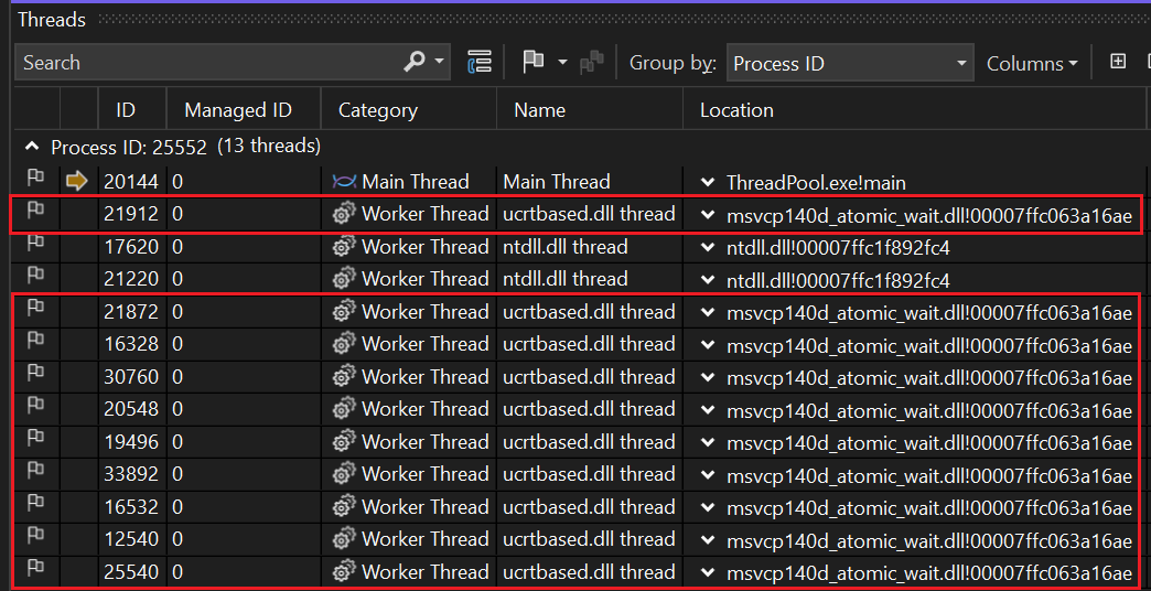 在Debug-Windows-Threads中,可以看到目前程序中的线程状况: