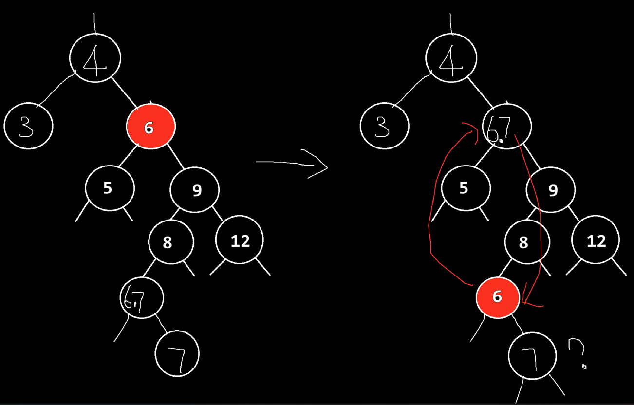 如果有两个子树,则选取一个叶子节点交换(选择两支子树中相近大小的节点替代自身),即把将要删除的节点下移至叶子节点或者下移至只有一支子树的状态,就可以转化为情况1、2了。