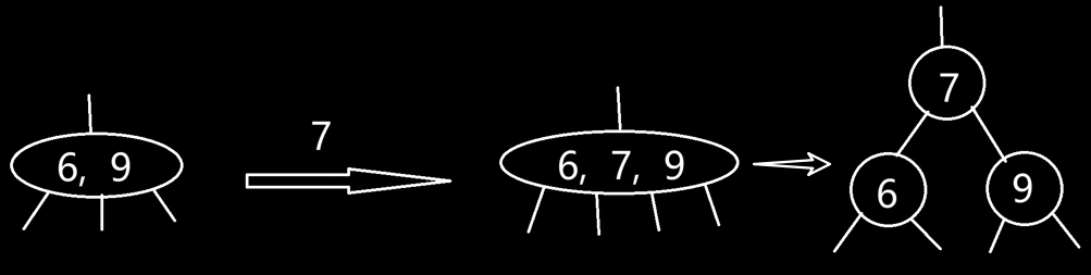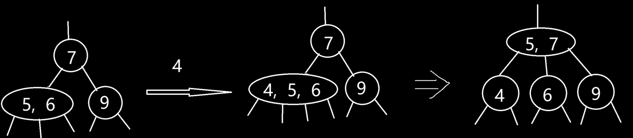 但是,就要解决一个问题,即4-型节点再插入一个节点,怎么处理?是允许临时5-型节点存在吗?这样就使程序复杂化了。