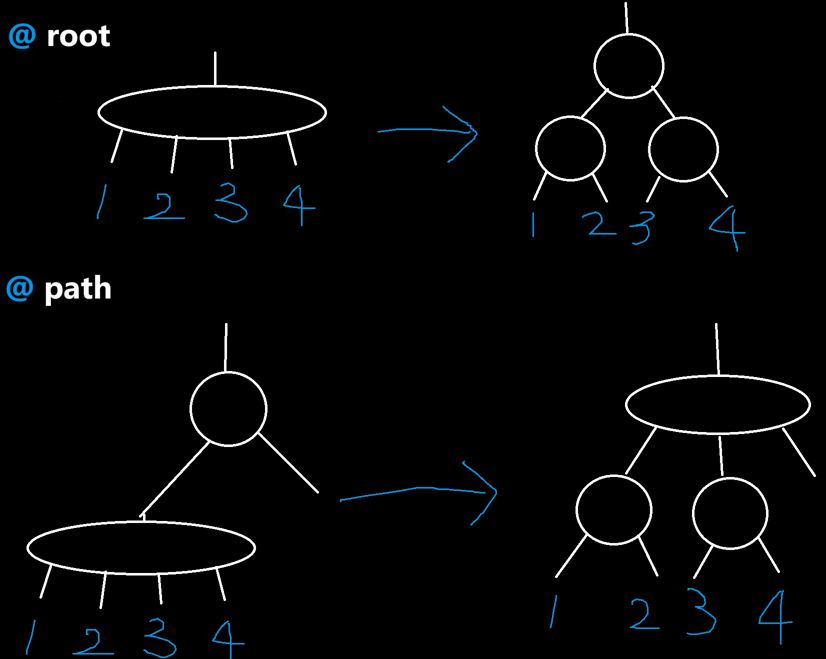 在递归向下、插入之前,事先分解掉红黑树中所有的4-型节点(但必须是等价转化,不能让2-3-4树形式上的层数变多,对于红黑树形式来说,可能会多1层,但还是符合平衡的要求范围内的,可以看上图)。这样,后续插入时就不会存在4-型节点,要么是2-型、要么是3-型。