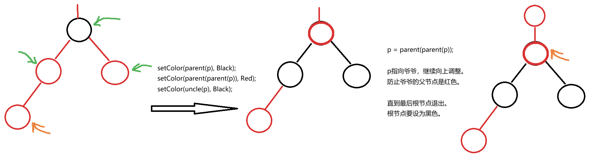 爷爷、父、叔全部翻转颜色。爷爷的父节点可能还是红色,需要不断向上调整,直到达到根,根记得设为黑色。