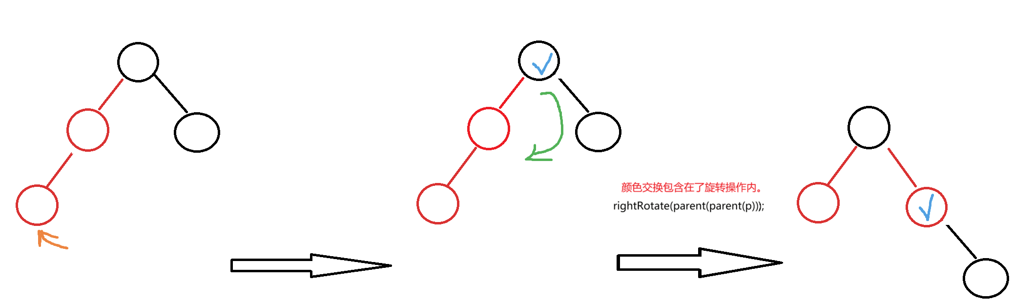 翻转父节点、爷爷节点颜色,之后以爷爷节点右旋。