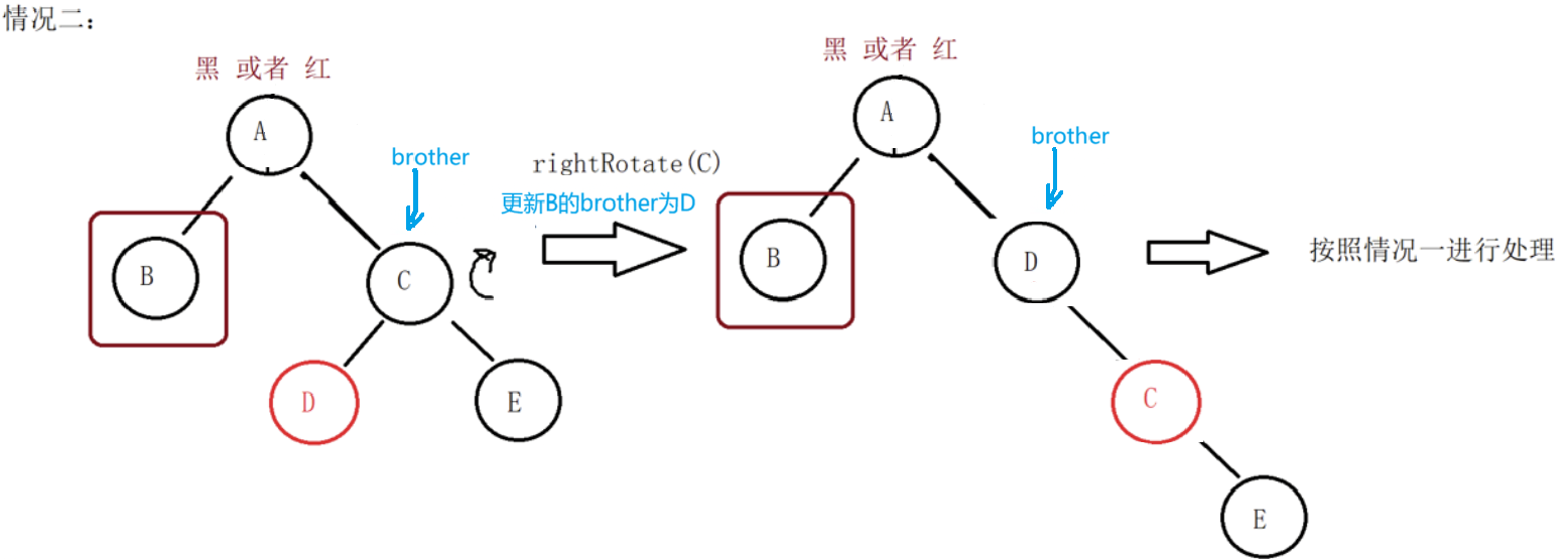 以根为轴,左旋。这样,要删除的节点就有了黑色兄弟。