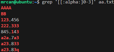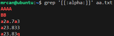 :表示所有字母grep '[[:alpha:]]' file.txt