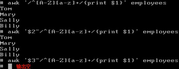 第二句awk的意思是只搜索每一行的第3列,查找以大写字母开头,后面至少有一个小写字母。匹配到后,打印该行的第1列。由于第三列全是数字,没有匹配到符合条件的行,所以打印空。