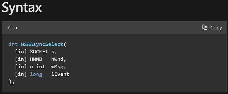 1 rc = WSAAsyncSelect (s, hWnd, wMsg, FD_READ|FD_WRITE);