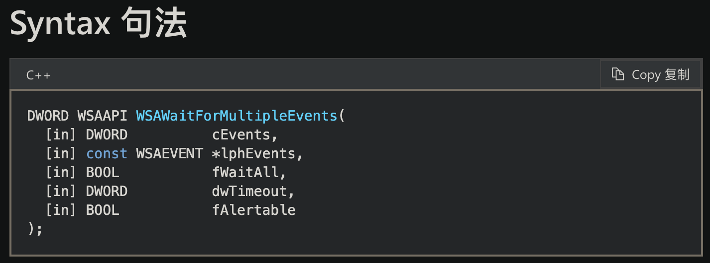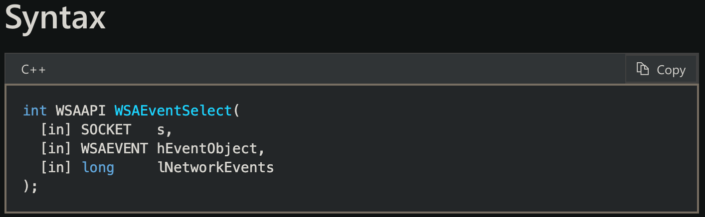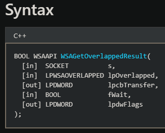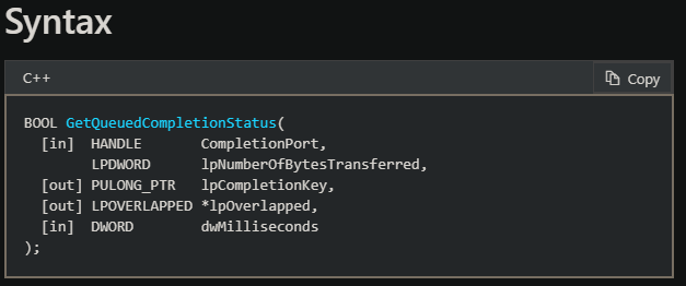 1 2 3 4 5 6 7 8 9 10 11 12 13 14 15 16 17 18 19 20 21 22 23 24 25 26 void worker (void ) { DWORD bytes_transferred{ 0 }; Entry* entry{ nullptr }; LPOVERLAPPED povl{ nullptr }; while (true ) { bool succeed = ::GetQueuedCompletionStatus ( iocp, &bytes_transferred, reinterpret_cast <PULONG_PTR>(entry), &povl, INFINITE); if (!succeed) { continue ; } if (entry->_event_type == ...) { } } }