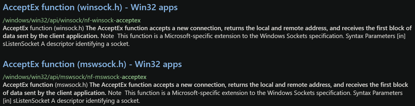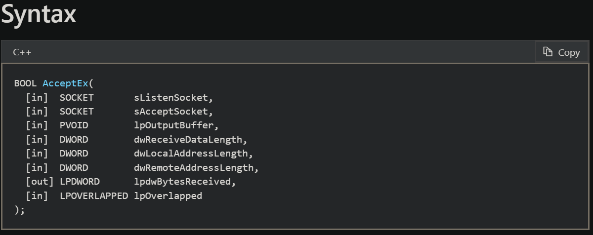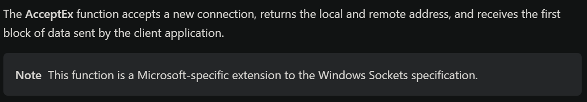 1 2 3 4 5 6 7 8 9 10 11 12 13 14 15 16 17 18 19 20 21 22 23 24 25 26 27 28 29 30 SOCKET work_sock = ::WSASocket (AF_INET, SOCK_STREAM, IPPROTO_TCP, nullptr , 0 , WSA_FLAG_OVERLAPPED); char * address_buf = new char [sizeof (sockaddr_in) * 2 + 32 ]; DWORD length_received{ 0 }; OVERLAPPED ovl; ovl.hEvent = ::WSACreateEvent (); Entry* entry = new Entry{ EventType::ET_ACCEPT, listen_sock, work_sock, address_buf, ovl }; bool res = AcceptEx ( listen_sock, work_sock, address_buf, 0 , sizeof (sockaddr_in) + 16 , sizeof (sockaddr_in) + 16 , &length_received, &entry->_ovl); if (!res) { if (ERROR_IO_PENDING != ::WSAGetLastError ()) { return 1 ; } }