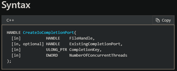 1 2 3 4 5 6 7 8 9 10 HANDLE iocp{ nullptr }; int main () { iocp = ::CreateIoCompletionPort (INVALID_HANDLE_VALUE, nullptr , 0 , 0 ); ::CloseHandle (iocp); iocp = nullptr ; }